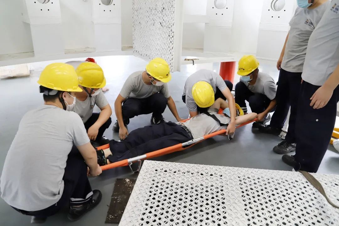 本次演练结合实际,模拟的场景为:一线作业人员在中盾内组装时,由于操作不当导致支架平台砸伤了作业人员的腿部,在车间内巡查的安全员发现受伤情况后马上汇报,车间负责人立即组织人员施救。
